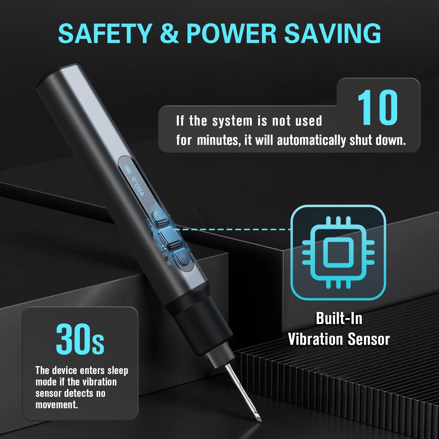 - 🧠 Smart Gravity Sensor & Auto-Sleep Work safer and smarter. Thanks to built-in gravity sensing, the iron automatically enters sleep mode after 30 seconds of inactivity to protect the tip. If left completely idle for 10 minutes, the system automatically shuts down to eliminate fire hazards and save battery life.