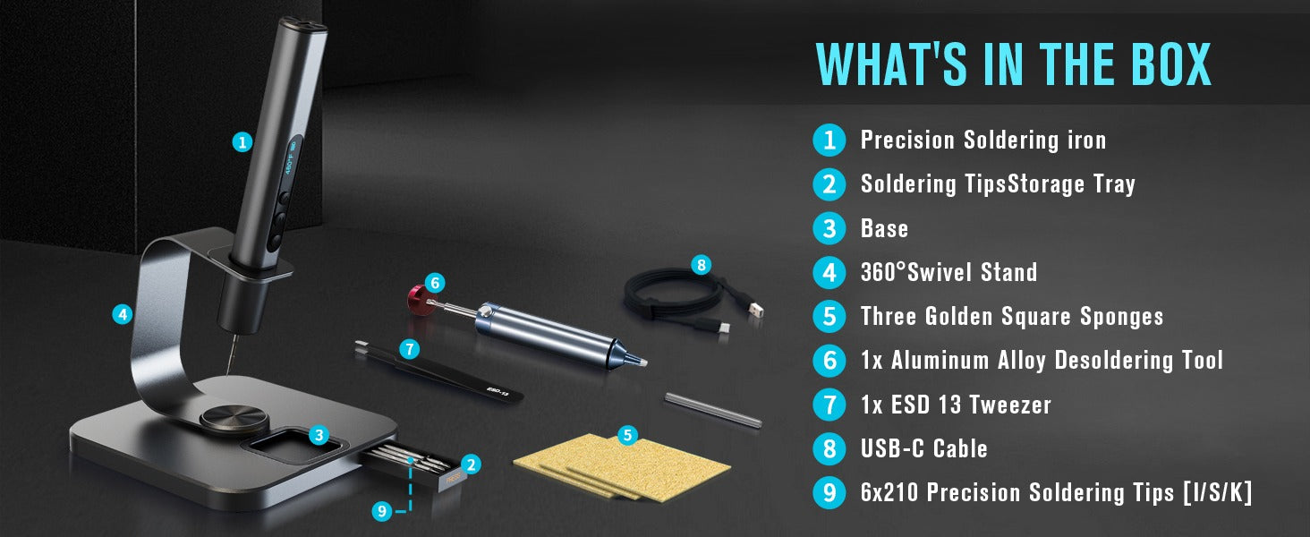 - ⚡ Lightning-Fast 7s Heating Time is money. Equipped with a high-performance heating core and 6 pcs tailor-made C210 tips (2 of each: C210-I, C210-IS, C210-K), this iron reaches your ideal working temperature in just 7 seconds. The tips are highly anti-oxidative, ensuring a long lifespan and flawless soldering on complex tasks.